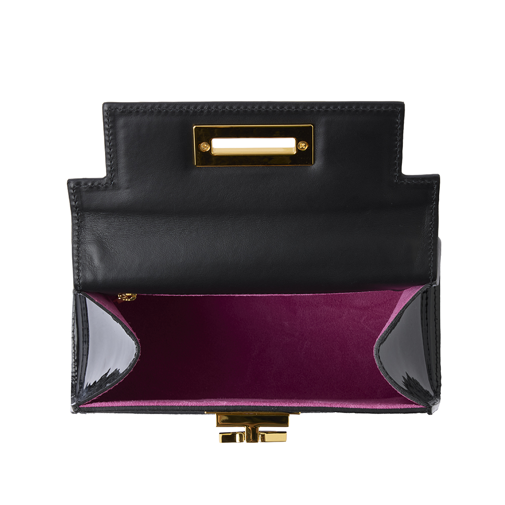 Questa versione della Licia si distingue per il contrasto elegante dei materiali. Il corpo frontale in cavallino nero dona alla borsa un carattere deciso e sofisticato, mentre la struttura in pelle vernice lucida esalta la silhouette iconica del modello con un tocco di luminosità e modernità. L’interno è rifinito con una morbida fodera in camoscio beige, piacevole al tatto e curata nei minimi dettagli.
