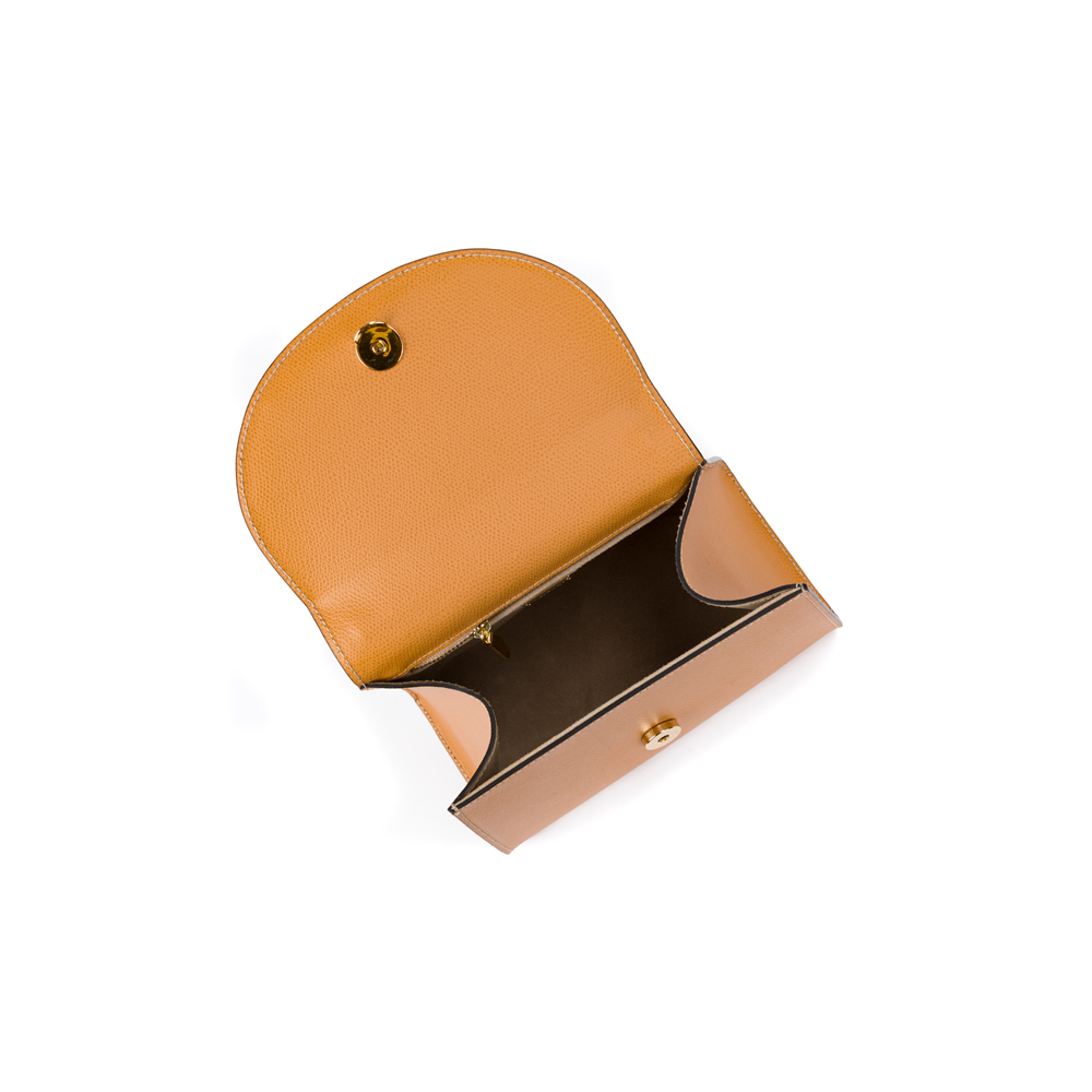Realizzata in pelle palmellata color miele, conquista al primo sguardo con la sua texture sofisticata e la silhouette armoniosa. La chiusura in metallo dorato, che riprende con stile le iniziali del fondatore Domenico Carbotti, resta il simbolo di un’eccellenza artigianale tutta italiana: un dettaglio elegante, riconoscibile e intriso di personalità.