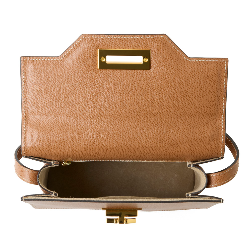 Giulia 270 è una borsa in stile messenger in vitello palmellato ed è foderata in pelle scamosciata. Giulia è costituita da un corpo a cartella con comparto interno unico e può essere chiusa grazie a una chiusura a leva.